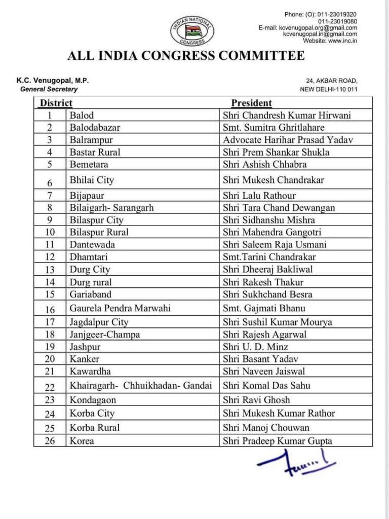 निशांत तिवारी /बिलासपुर. छत्तीसगढ़ में कांग्रेस के 41 जिलाध्यक्षों की लिस्ट जारी कर दी है। रायपुर सिटी से श्रीकुमार शंकर मेनन, रायपुर ग्रामीण से राजेंद्र पप्पू बंजारे, बिलासपुर शहर से सिधांशु मिश्रा और बिलासपुर ग्रामीण से महेंद्र गंगोत्री को जिला अध्यक्ष बनाया गया है।
