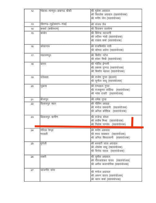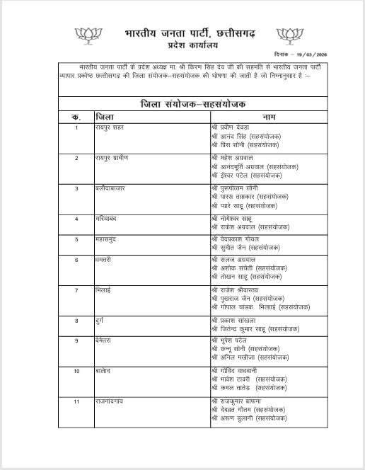 बिलासपुर । भारतीय जनता पार्टी के प्रदेश अध्यक्ष किरण सिंह देव की सहमति से भाजपा व्यापार प्रकोष्ठ छत्तीसगढ़ में जिला संयोजक एवं सहसंयोजकों की नियुक्ति की घोषणा की गई है। इस सूची में कुल 38 पदाधिकारियों को जिम्मेदारी सौंपी गई है, जिसमें संगठन को जमीनी स्तर पर और अधिक मजबूत करने का लक्ष्य रखा गया है।